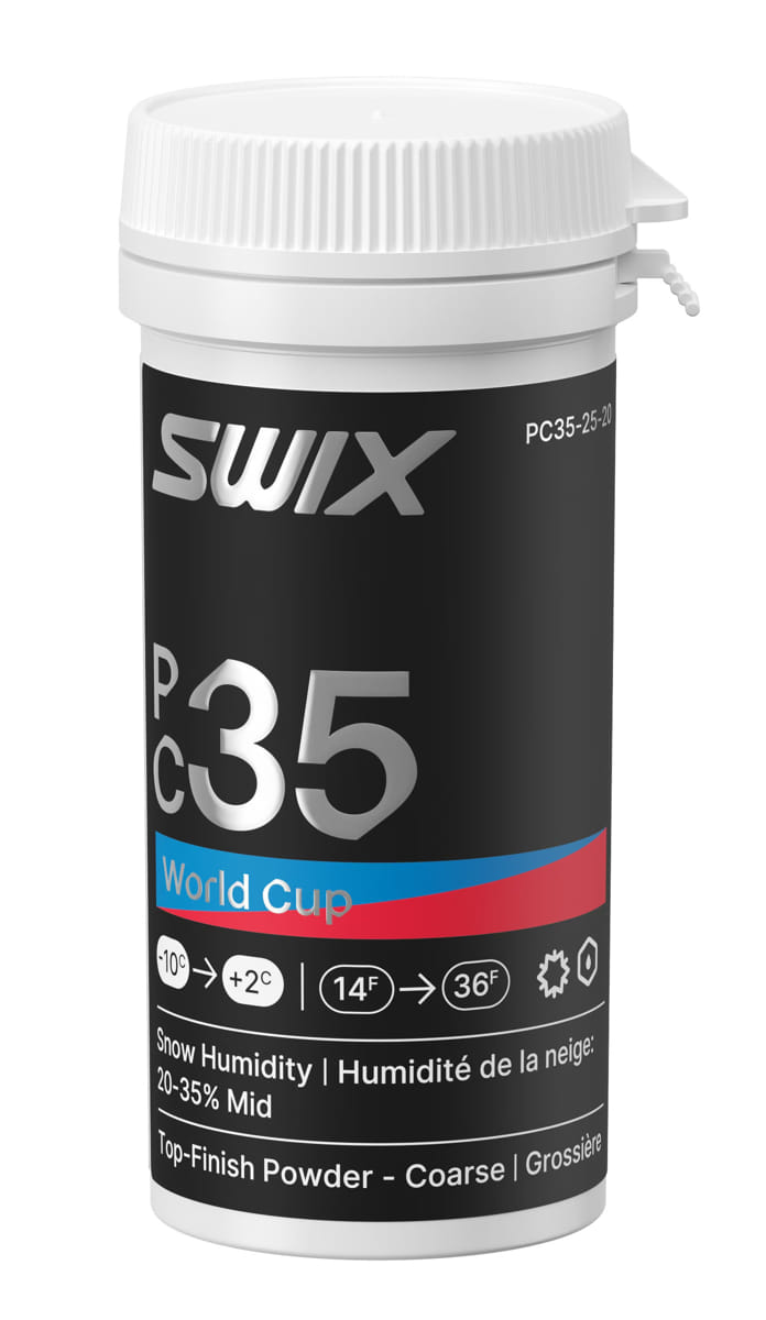 Proszek PC35 Coarse Mid zaprojektowany do wyścigów w średnio suchych i suchych warunkach, wykorzystuje technologię Swix Nano Contact, która minimalizuje tarcie i poprawia poślizg. Tworzy szybką, hydrofobową powierzchnię, idealną na gruby, odkształcony śnieg o wilgotności wynoszącej od 20 do 35%.