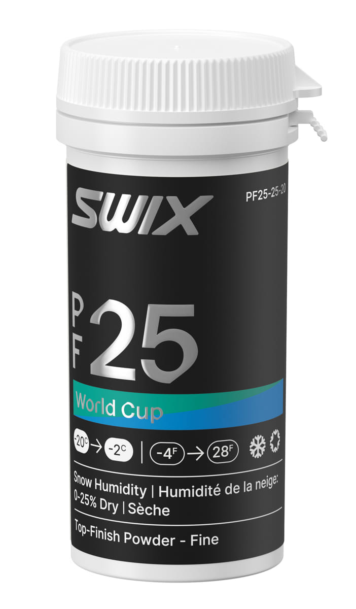 PF25 Fine Dry to proszek o wysokiej wydajności przeznaczony do nowego lub bardzo drobnoziarnistego śniegu w suchych warunkach. Wykorzystuje technologię Swix Crystal Shield, aby stworzyć gładką, twardą powierzchnię, która minimalizuje tarcie i zapewnia długotrwałą prędkość. Najlepiej stosować przy wilgotności śniegu od 0% do 25% w zakresie temperatur od -2*C do -20*C.